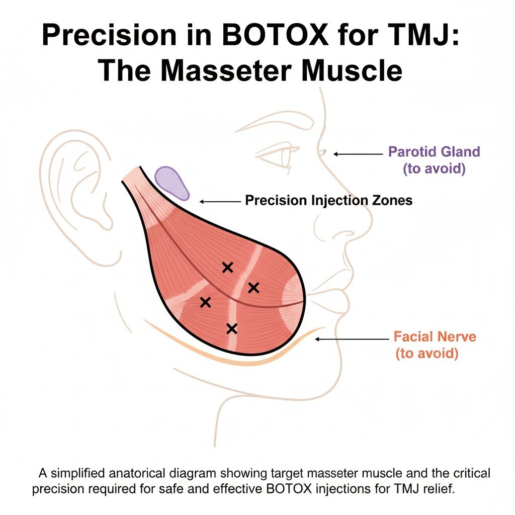 A simplified anatomical diagram showing the target masseter muscle and the critical precision required for safe and effective BOTOX injections for TMJ relief.